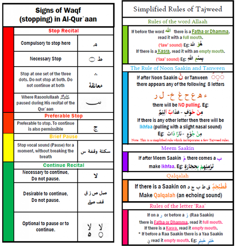Signs of where to stop during recitation of the blessed Qur’an alongside simplified rules of Tajweed